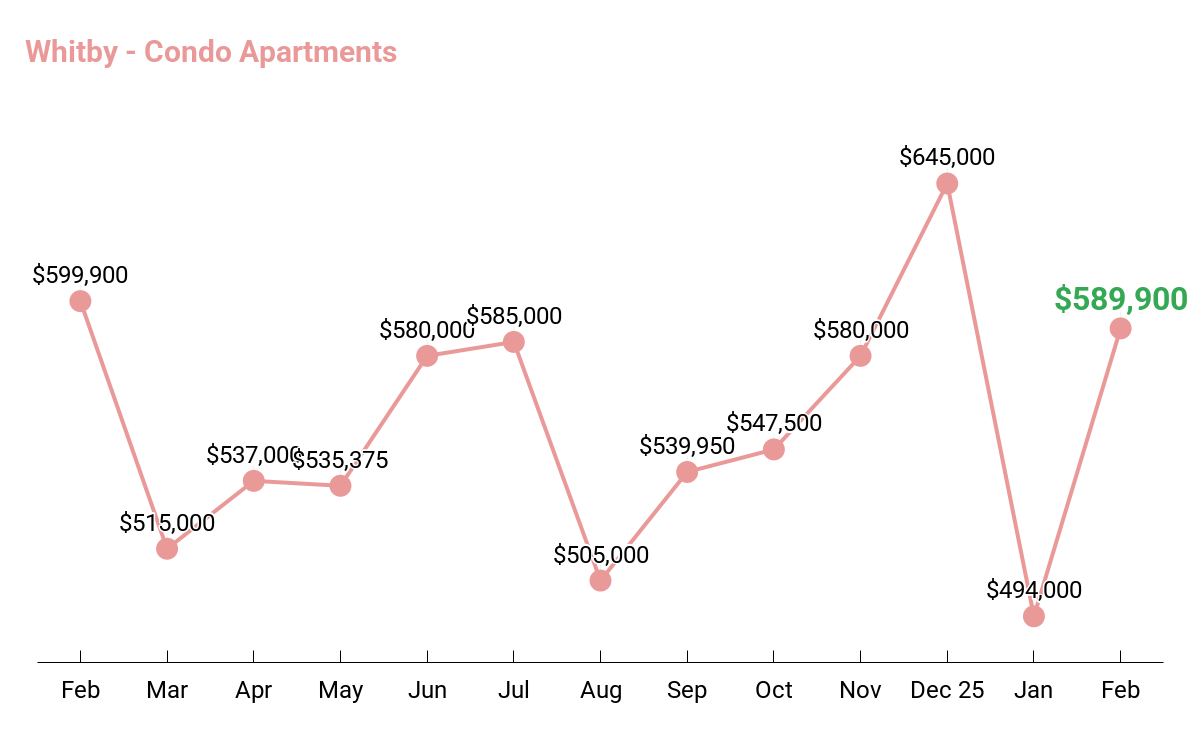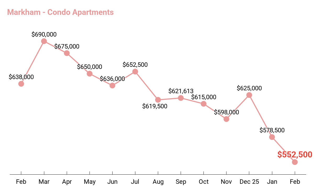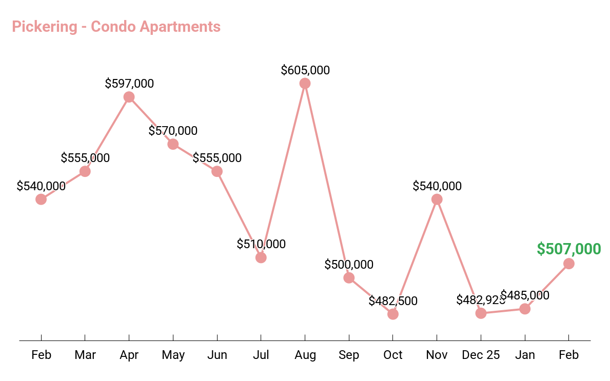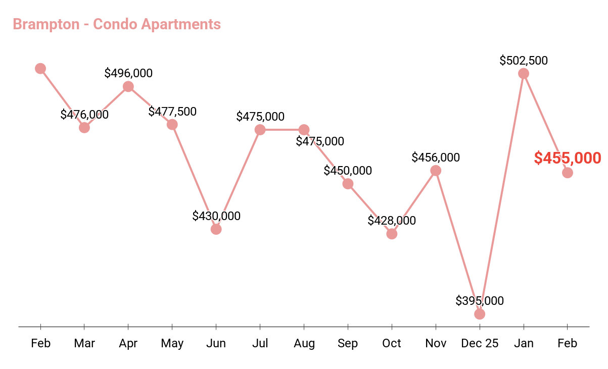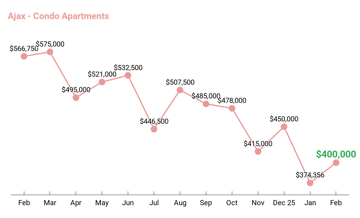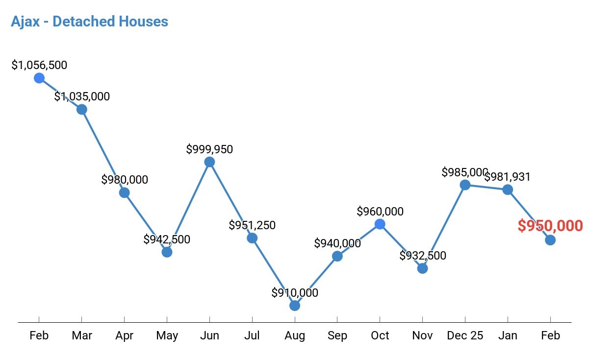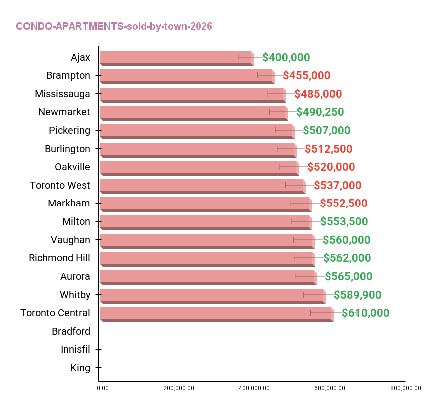 По данным на графике, самые низкие цены среди представленных городов зафиксированы в Ajax — около $400,000, далее идут Brampton — $455,000 и Mississauga — $485,000.