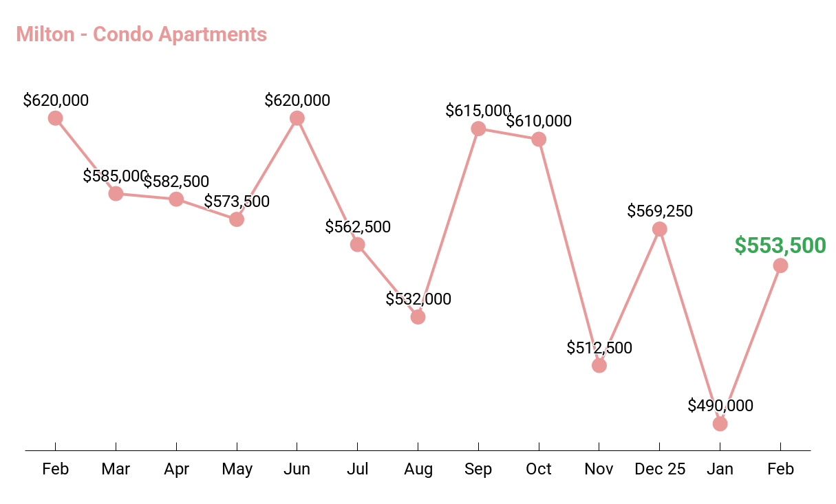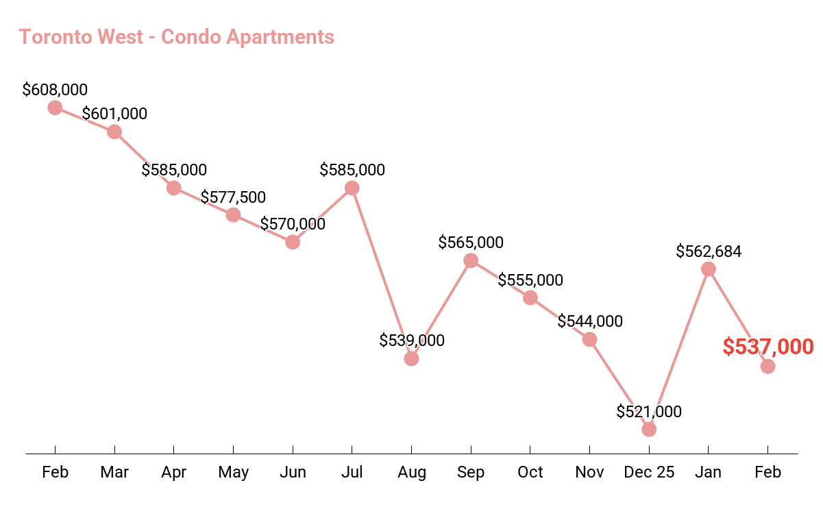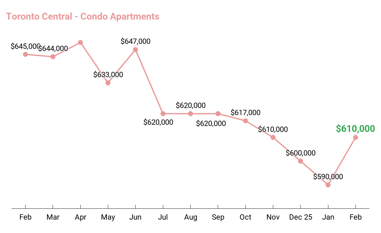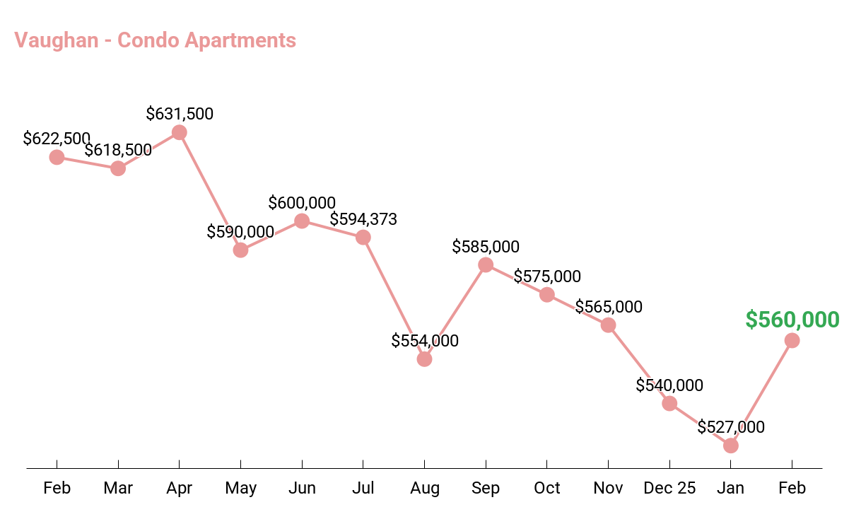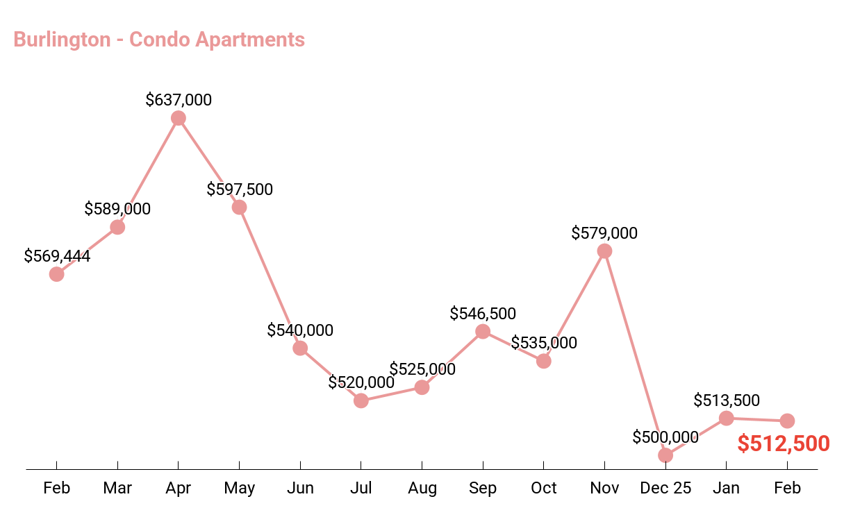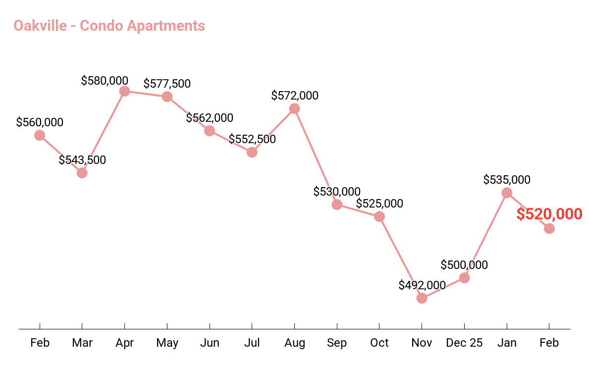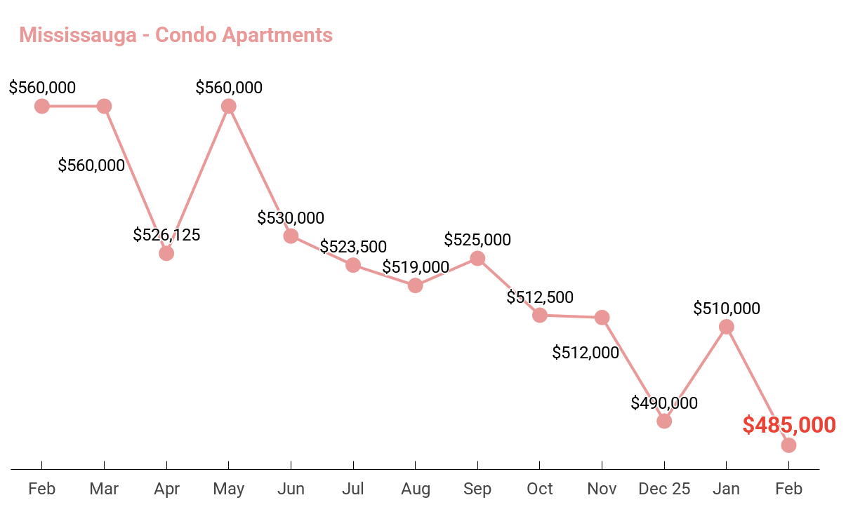 По данным на графике, самые низкие цены среди представленных городов зафиксированы в Ajax — около $400,000, далее идут Brampton — $455,000 и Mississauga — $485,000.